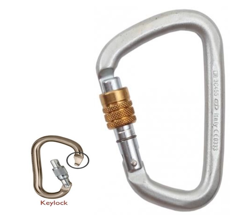 Uniwersalny, stalowy karabinek zakręcany o wysokiej wytrzymałości statycznej, przystosowany do pracy z węzłem półwyblinka. Zamek typu Keylock (bezząbkowy) zapobiega zahaczaniu o elementy włókiennicze.