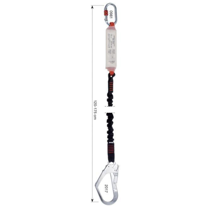 Lonża pojedyncza typu I z absorberem energii oraz elastycznym ramieniem zakończonym karabinkiem MGO o dużym prześwicie. W zestawie znajduje się również owalny karabinek stalowy do wpięcia w szelki bezpieczeństwa lub uprząż.